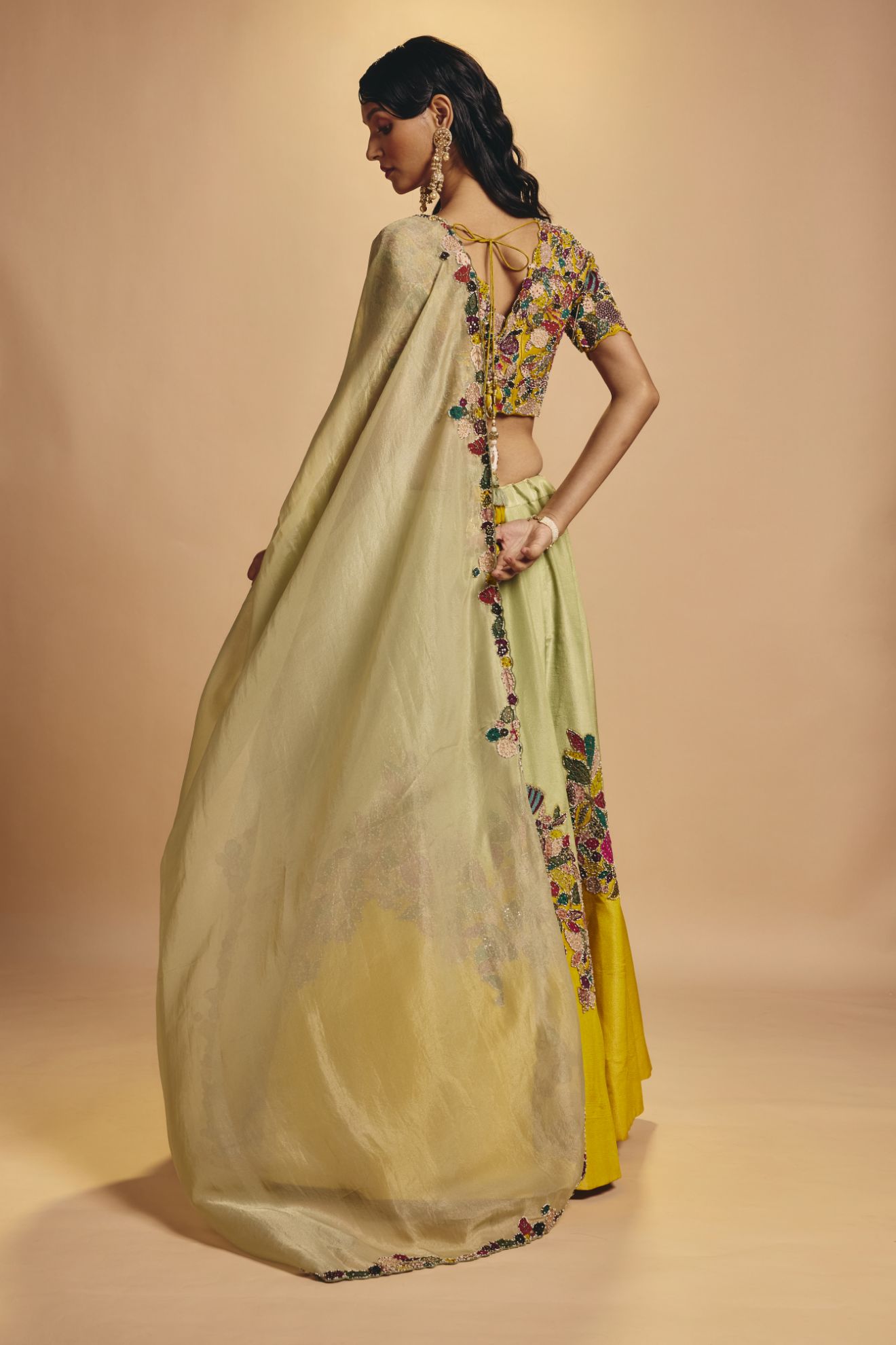 Lime-Green Silk Lehenga & Blouse with shimmer dupatta. Blouse has desgined with bead & patch work. Dupatta also has handwork detailing which give royal look . Perfect for Wedding wear.