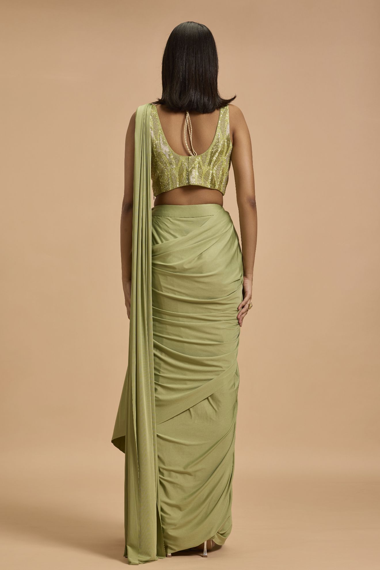 Green Ready to wear Saree eith full embrodiery Blouse with sleveesless. blouse has fully heavy embrodiery cutdana & sequence handwork. Both Cutdana & Sequence giving this saree a modern edge look. This is perfect blend of traditional & Fashion.